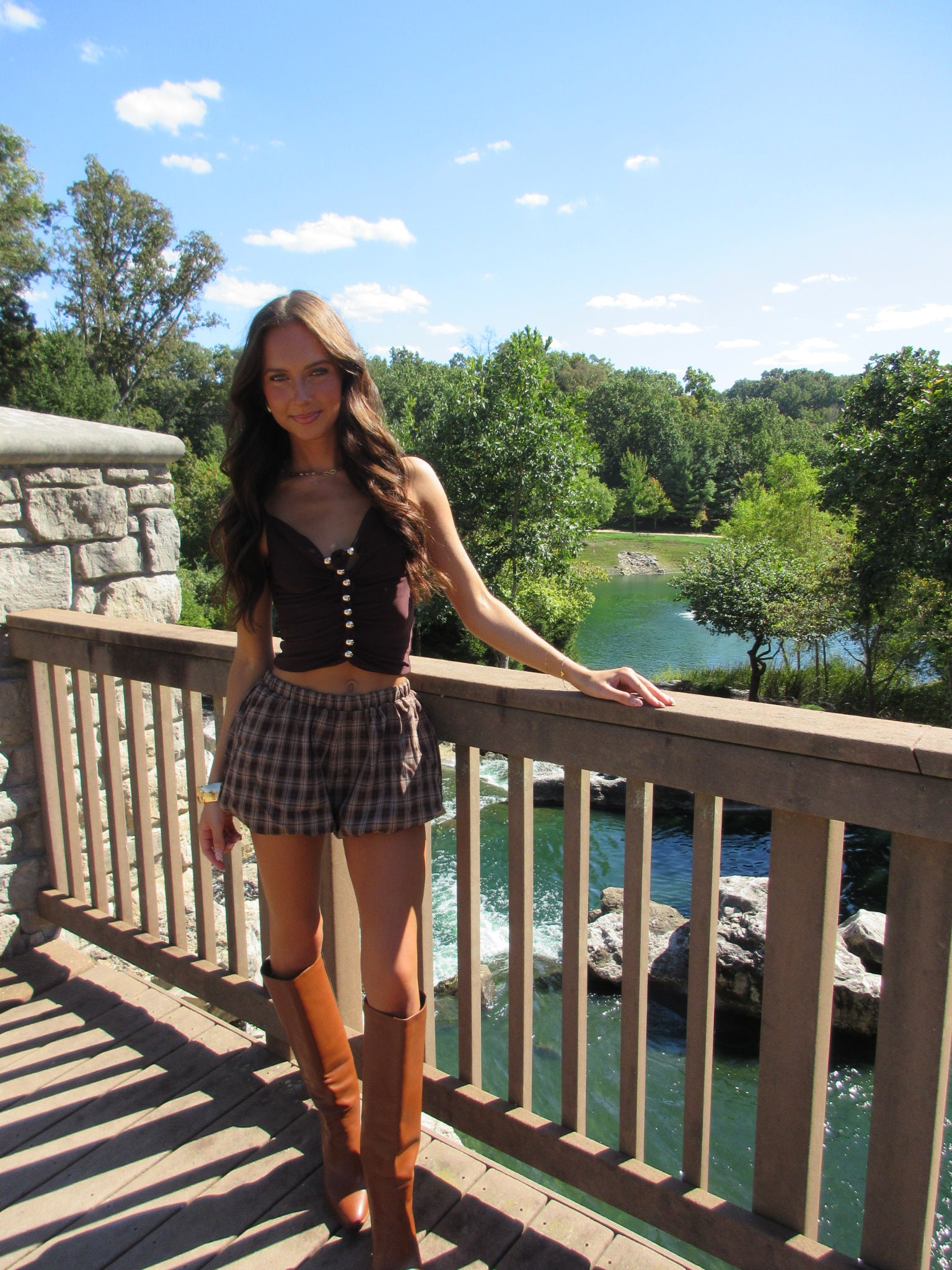 Showcase effortless style with our Brown Bead Top, designed for comfort and a perfect fit thanks to its stretchy fabric and adjustable straps. The unique gold bead accents down the center add a touch of elegance, making this top a versatile choice that pairs perfectly with jeans or a mini skirt for your next night out! Shown in images paired with our Plaid Bubble Shorts for the cutest fall outfit!!